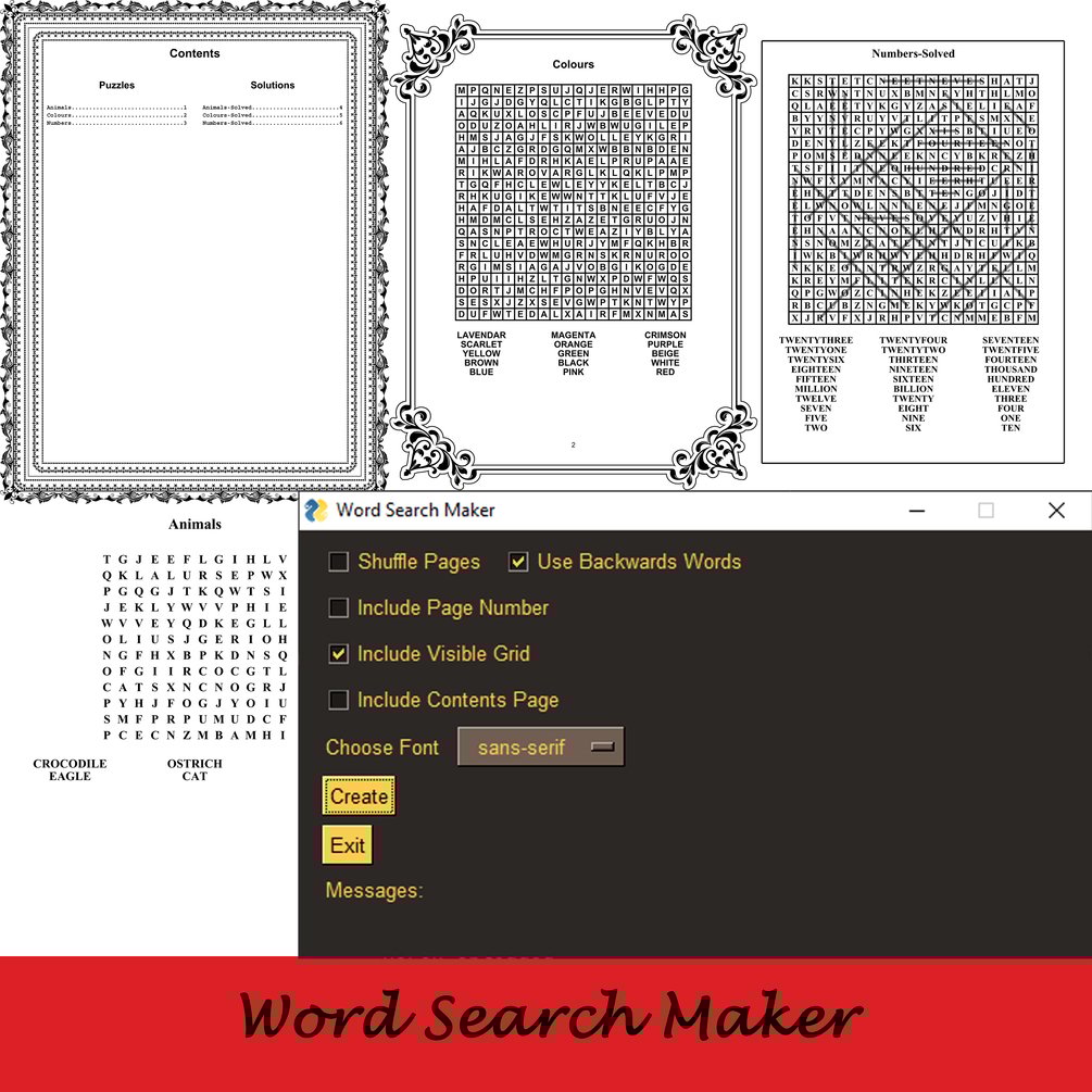 This program for Windows is able to generate customised word search pages using only text files containing word lists, allowing you to speedily create unique KDP word search interiors.